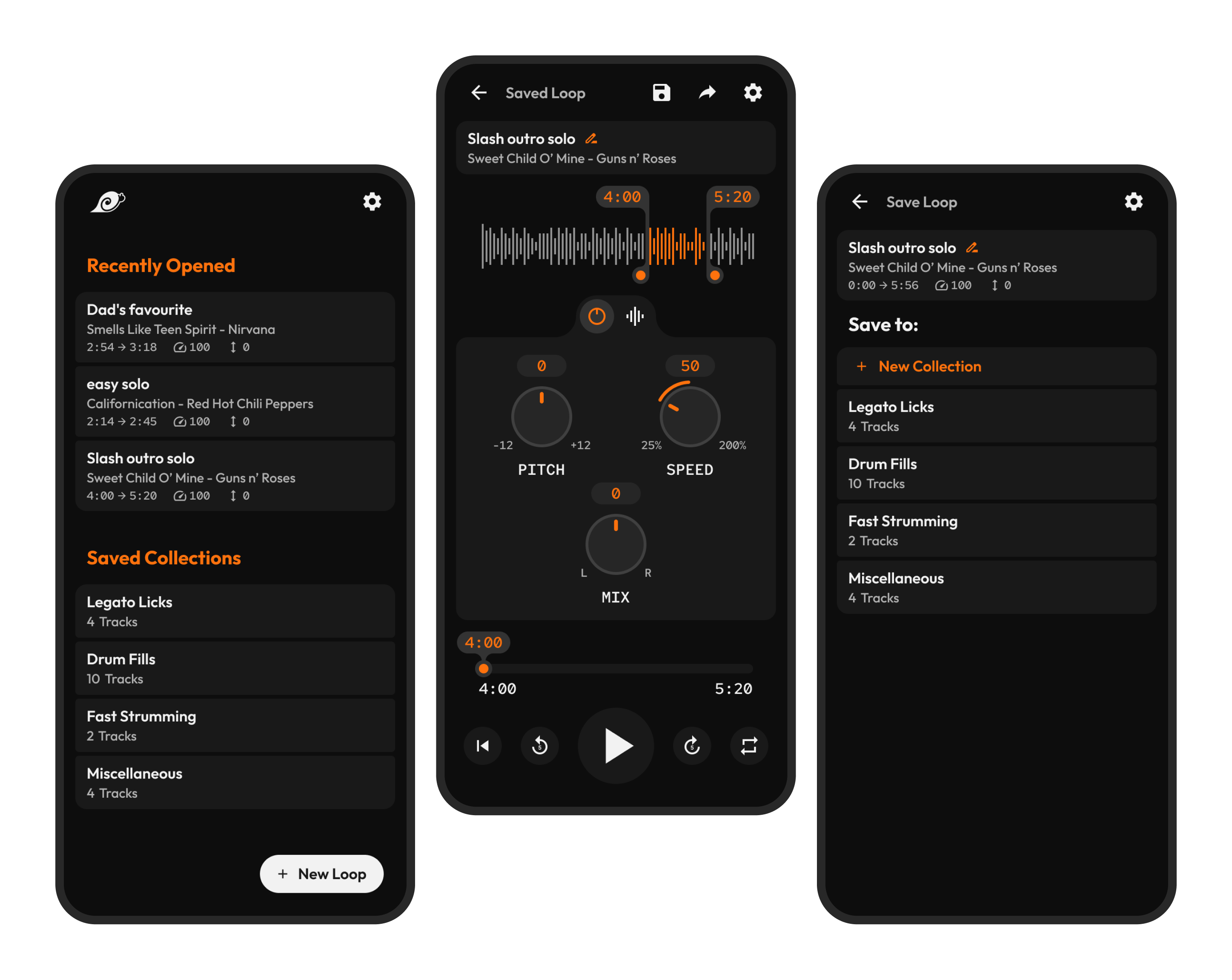 Users create new loops when practicing a new track, but more often than that, they want effortless access to previously created loops. The new app flow allows the user to save loops into named “collections” to improve findability. The user can create new collections to best fit their own categorization models. As per the redesigned IA, the user lands on a new home where they are presented with “Recently Opened” loops and their “Saved Collections.”