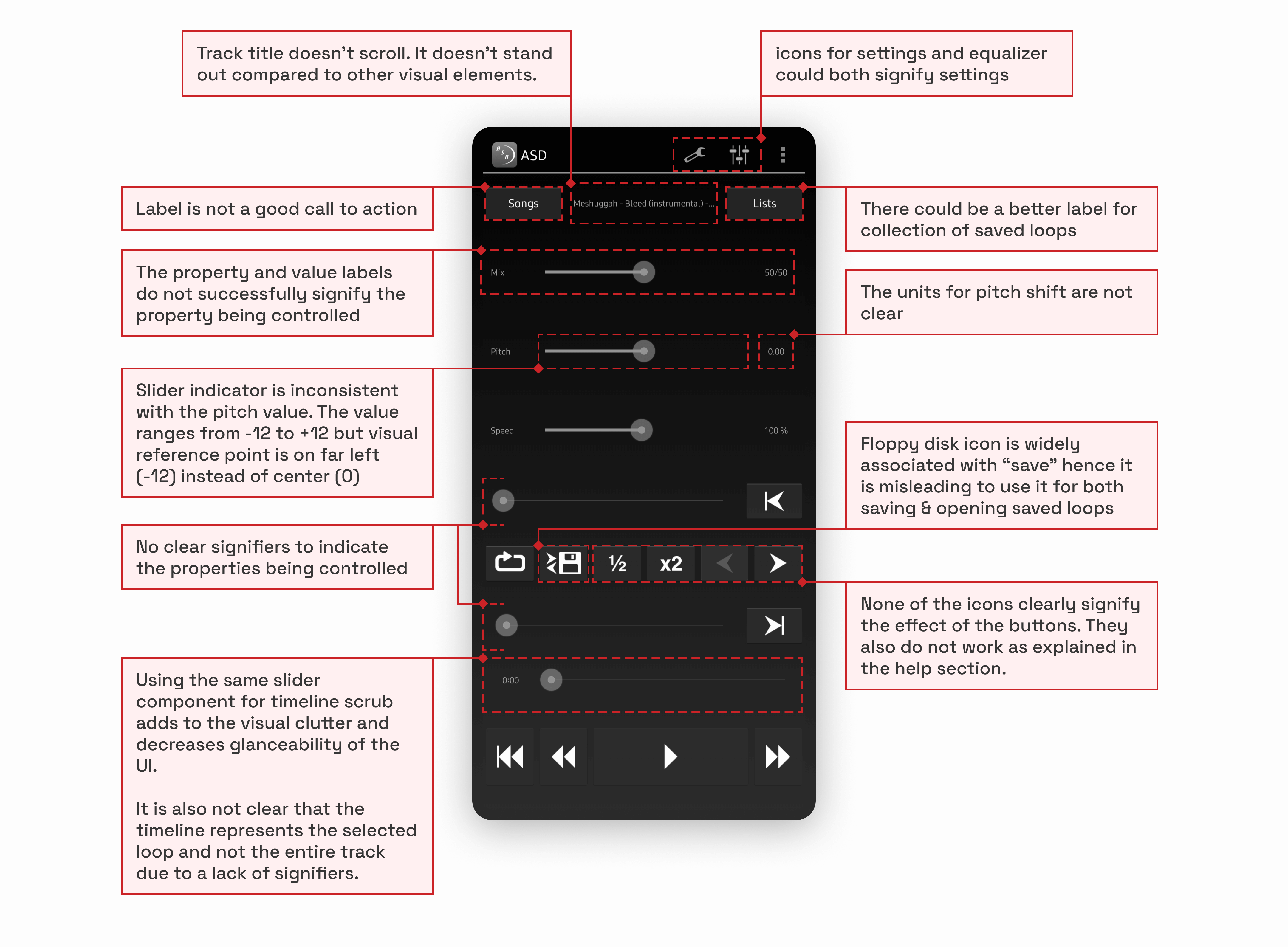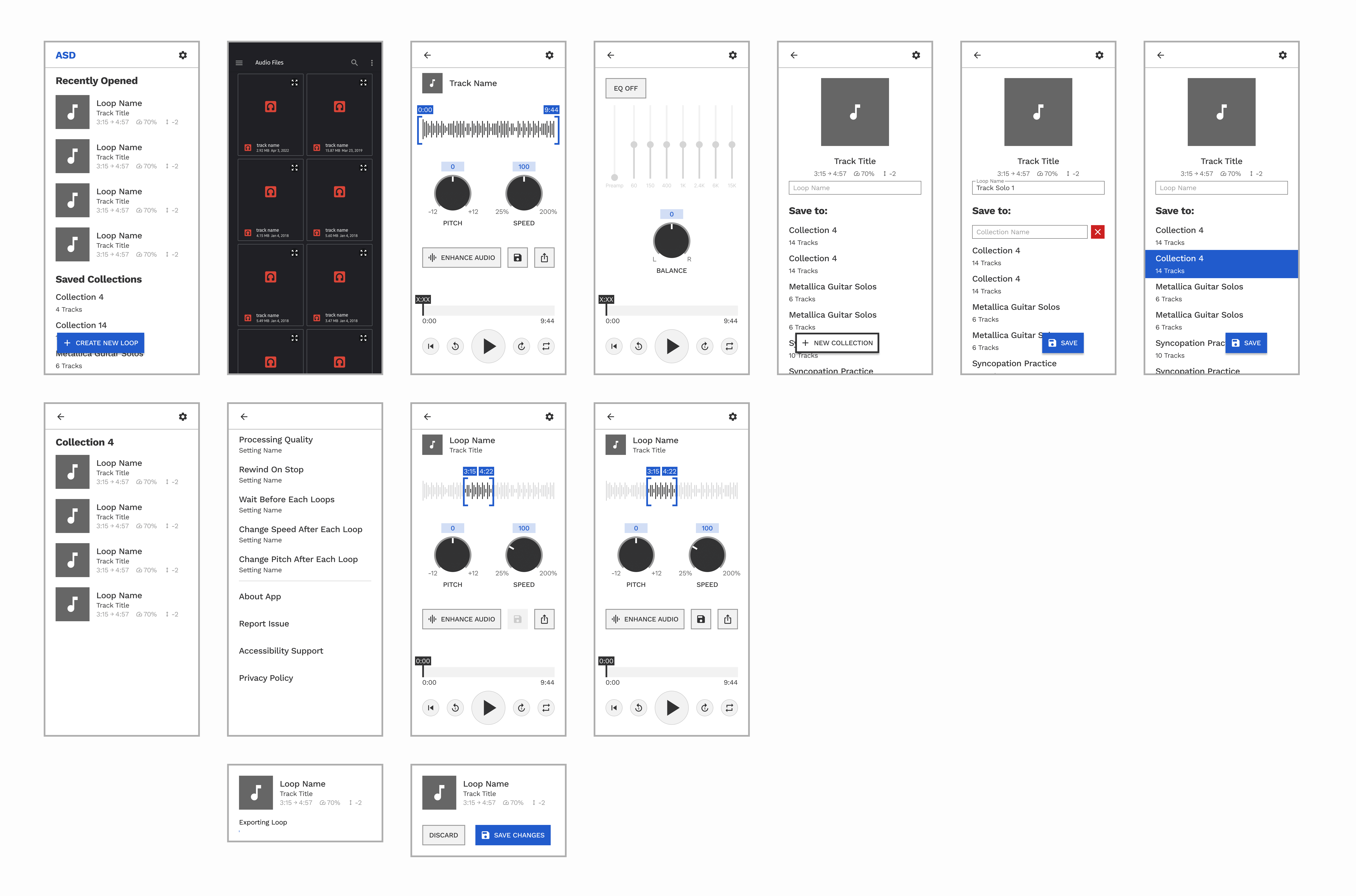 The mid-fi prototype served multiple purposes. It allowed me to conduct guerrilla usability tests using think-aloud protocol, mainly with a novice musician as the sole participant. In addition to usability, I used it for ergonomic testing, ensuring that frequently used interactive elements were comfortably accessible and that small target areas offered appropriate feedback. Moreover, it served as a foundation for planning essential components, various states, and dialogue prompts.