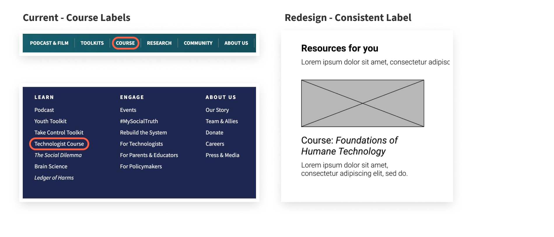 The current website uses multiple labels such as “Course”, “Technologist Course” for their course offering. This is inconsistent and non-descriptive. We decided to add the course’s name “Foundations of Humane Technology” to the label and moved it under “For professionals" > "Technologist”.