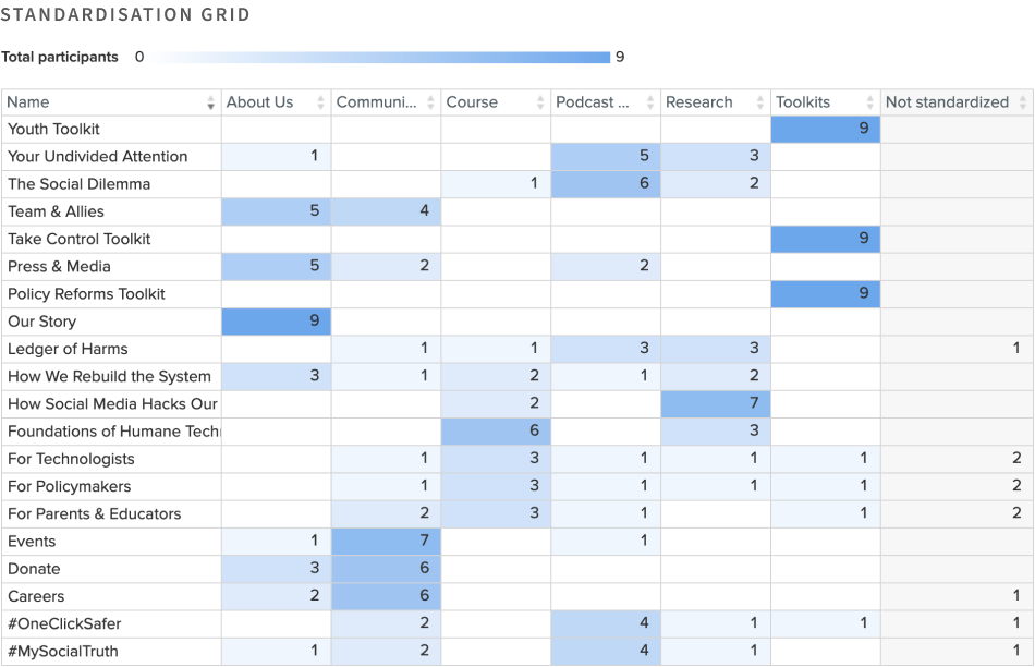 Many participants found certain labels like “How Social Media Hacks Your Brain”, “Your Undivided Attention”, “The Social Dilemma” to be non-descriptive of their content without context. These cards were sorted under multiple categories like “Courses”, “Research” or “Podcast & Film”, or even “Toolkits”.