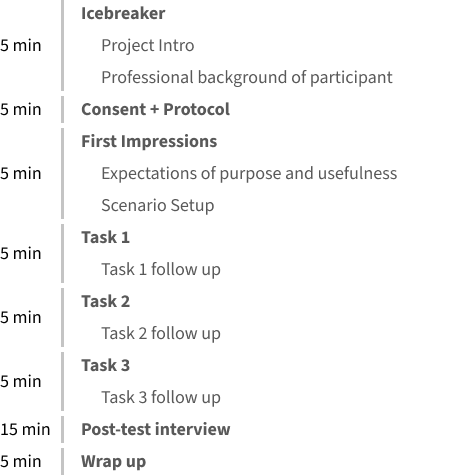 Participants were given a scenario relevant to their field to put their respective tasks into context. Each task was followed by a brief question to gather the participant’s general impression.